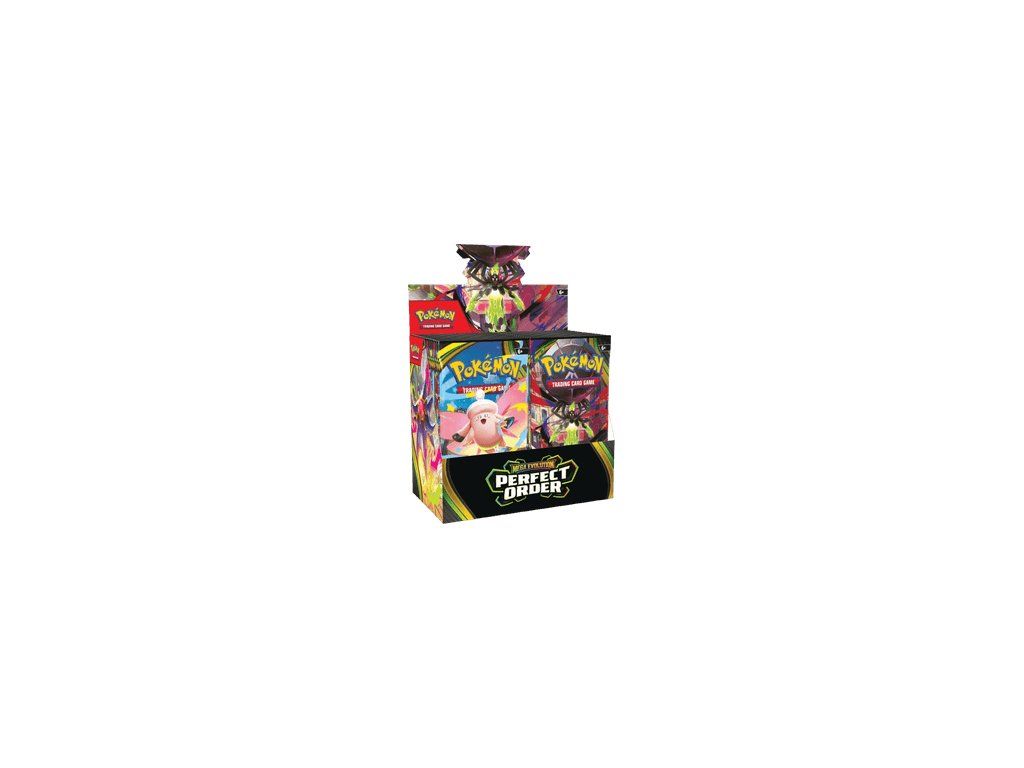 36 booster balíčkov z edície Pokémon TCG: Mega Evolution - Perfect Order Každý booster obsahuje 10 kariet, 1 základnú energiu a kód do Pokémon TCG Live (obsah balíčkov sa líši)